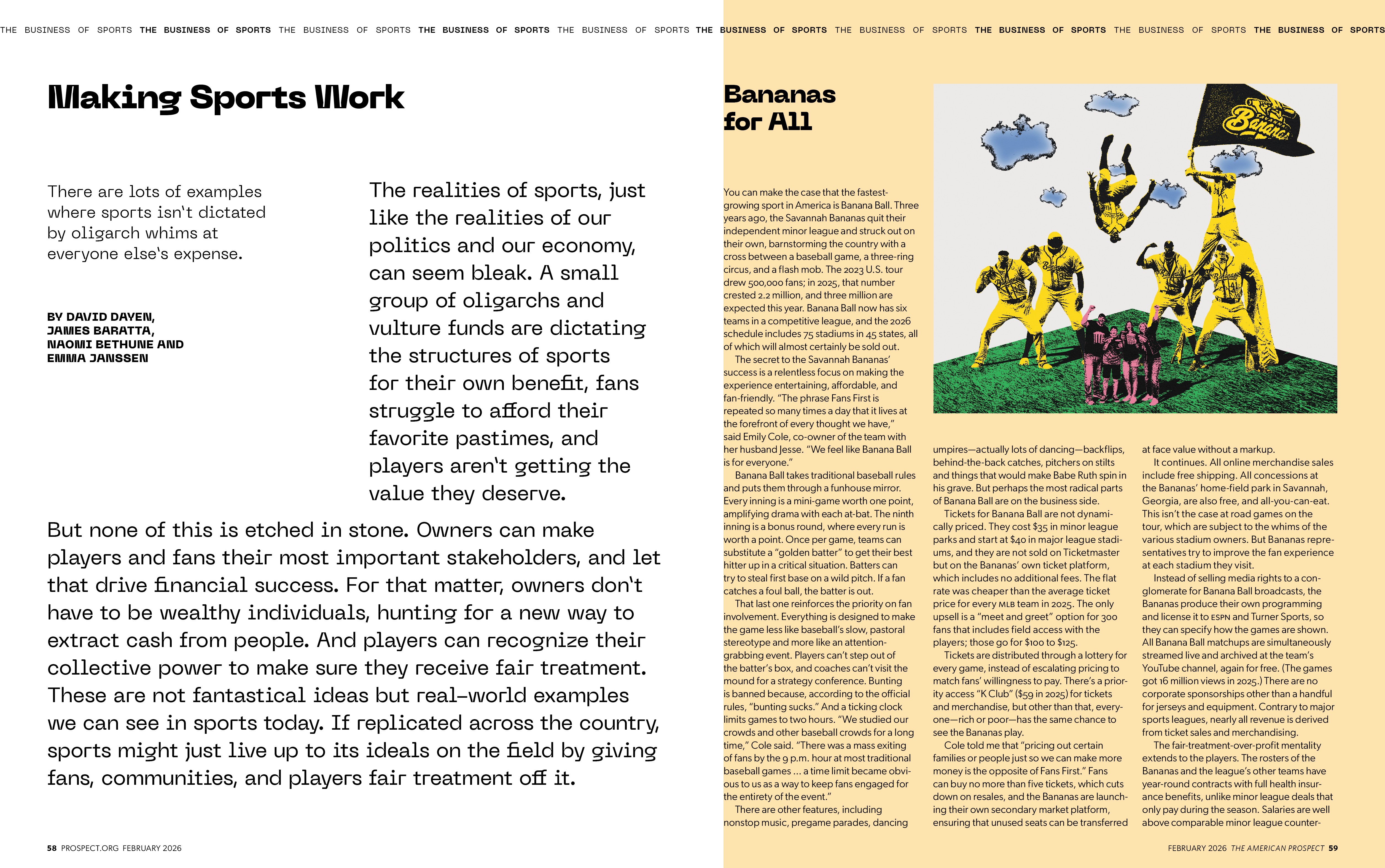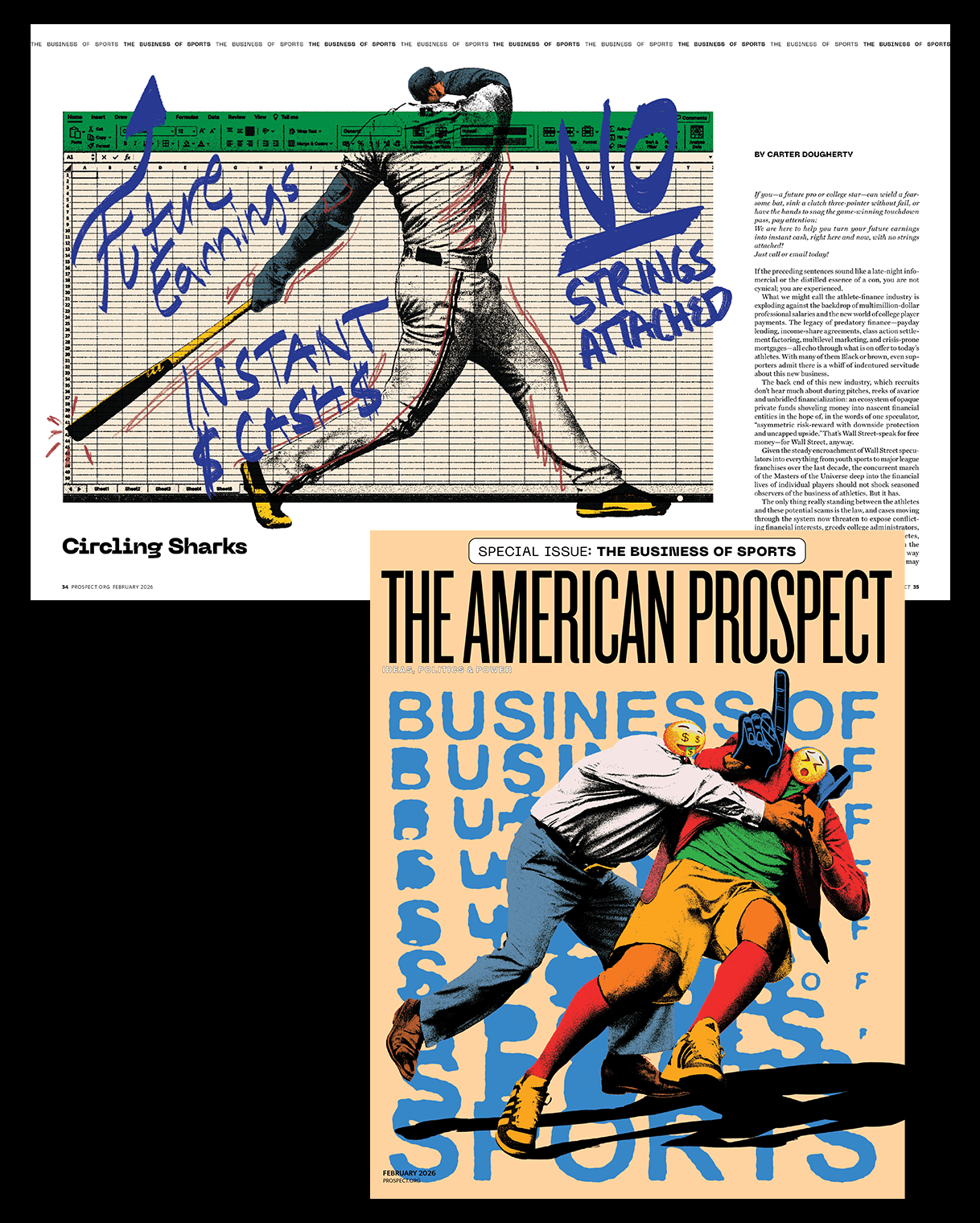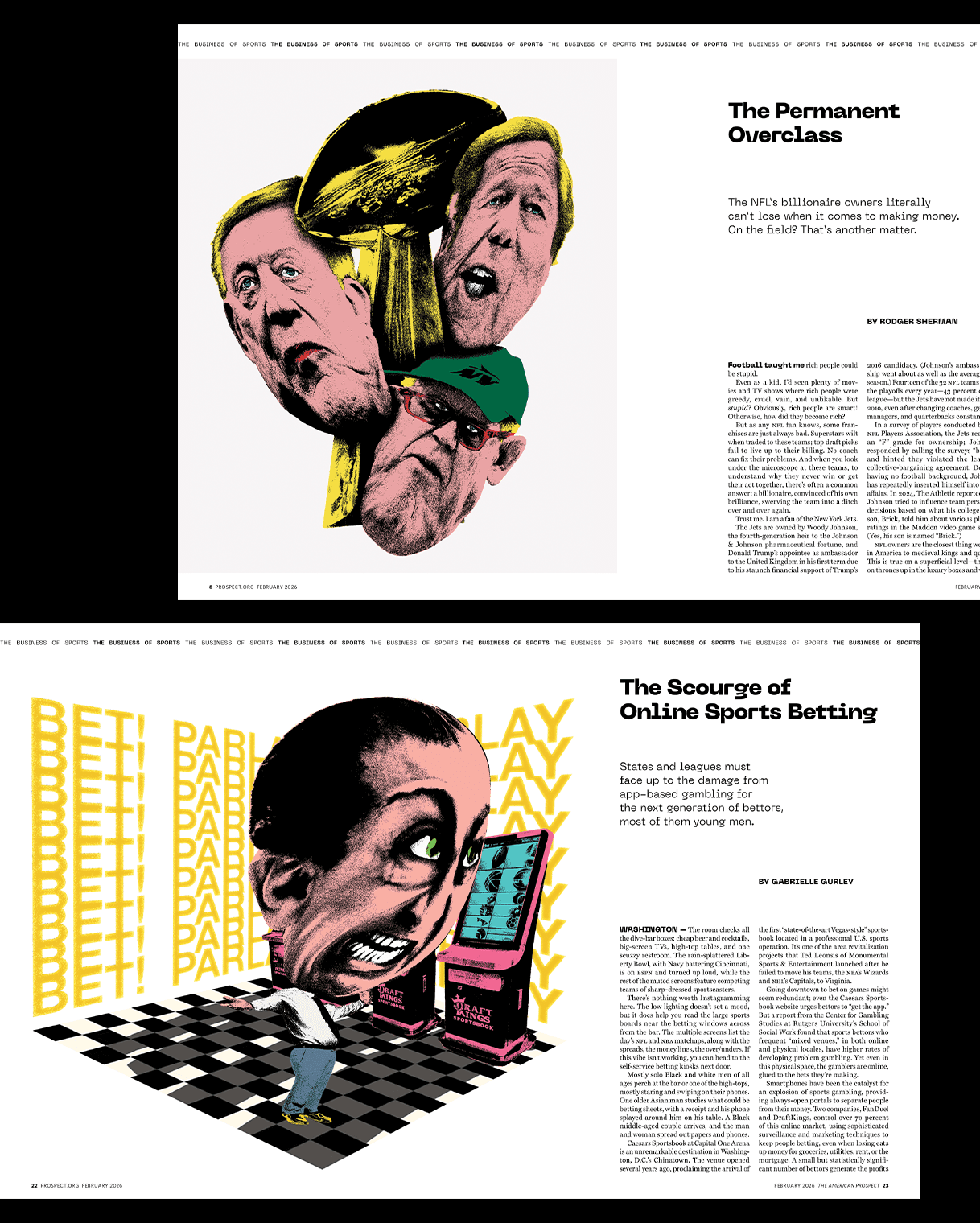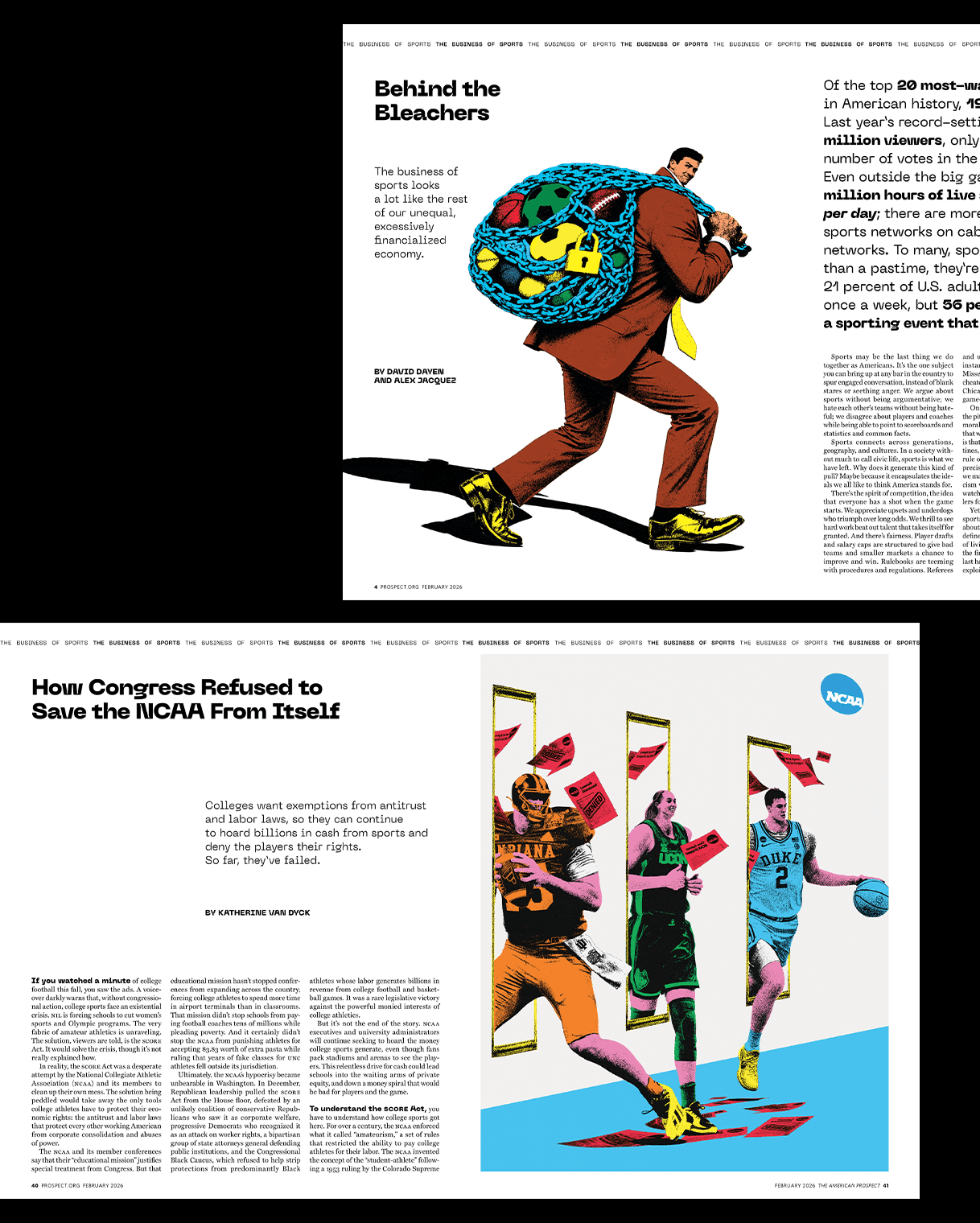 Editorial illustration work for The American Prospect’s February 2026 issue exploring the politics and economics of modern sports, from ownership and labor rights to fan culture and inequality.