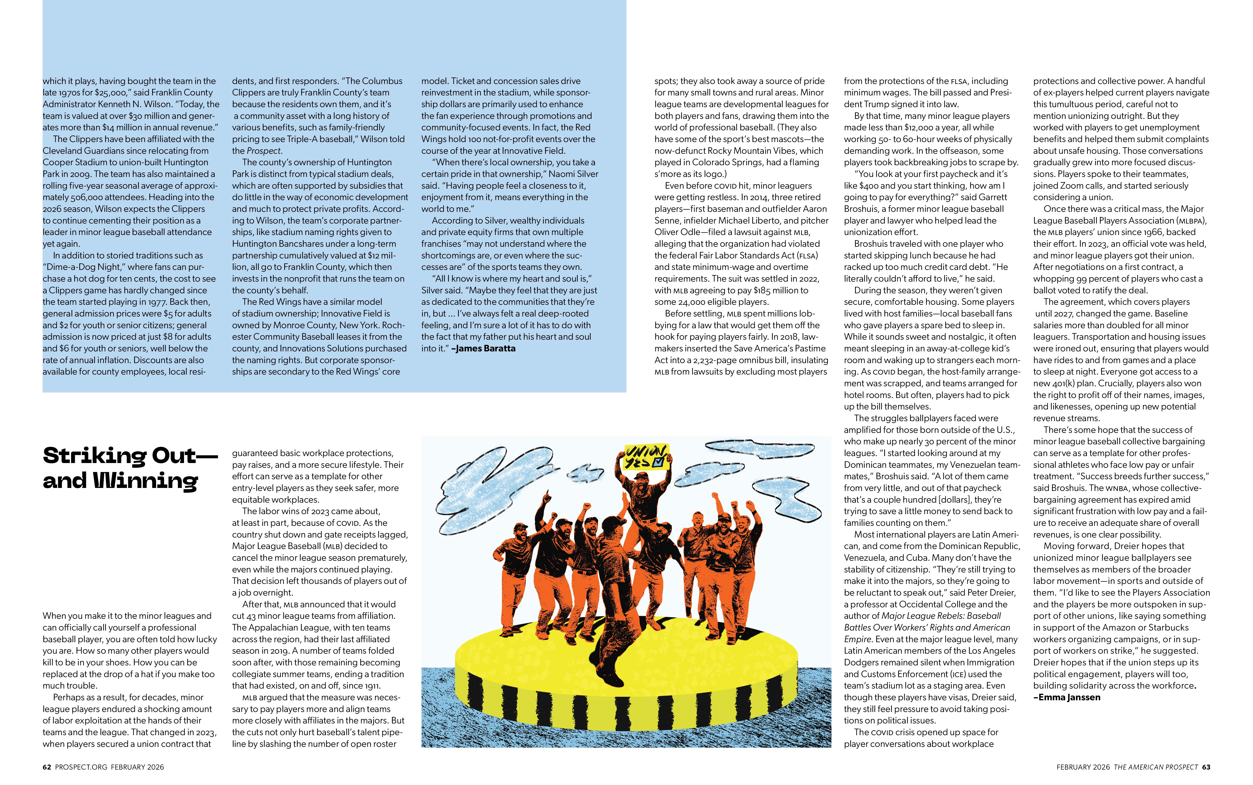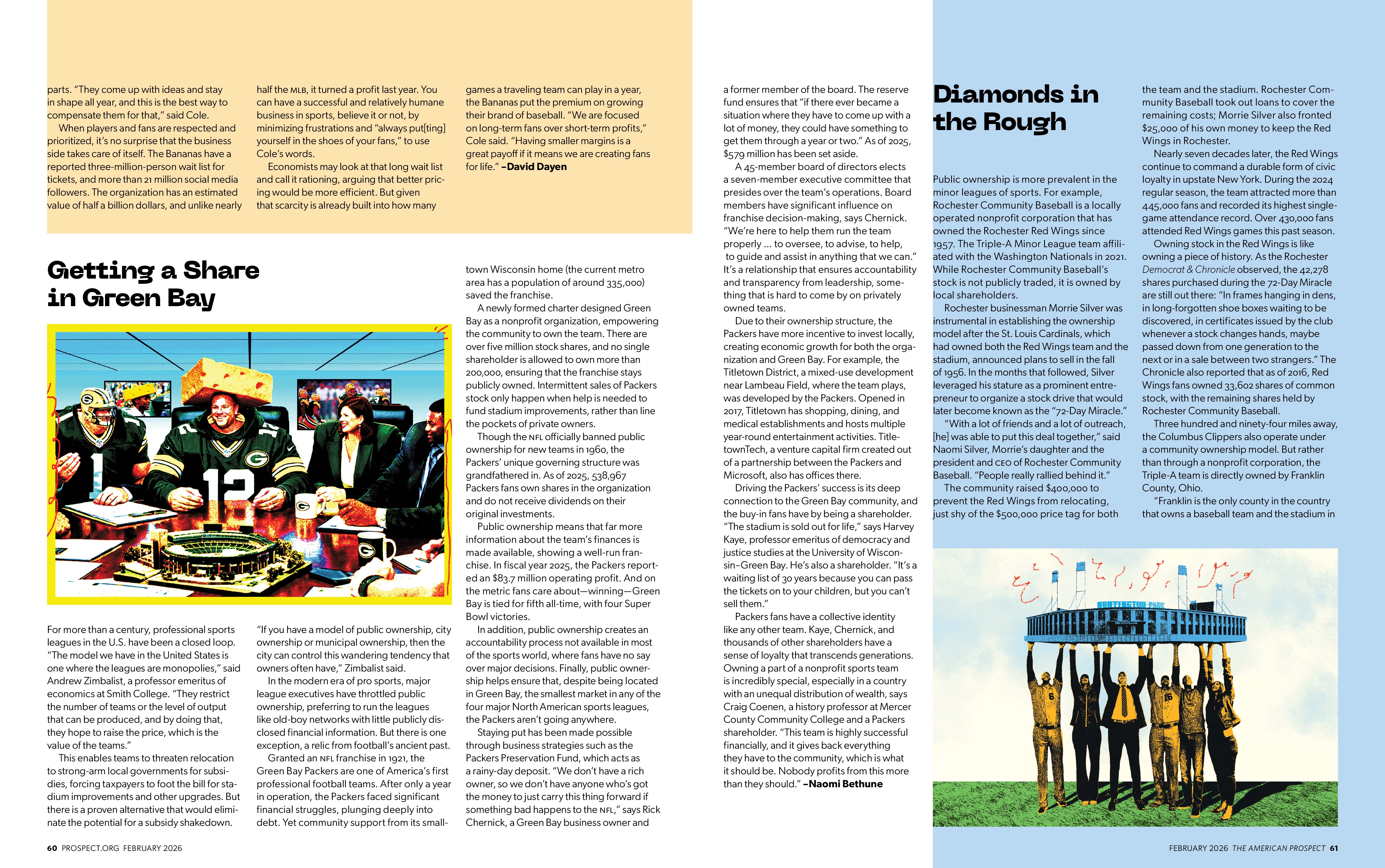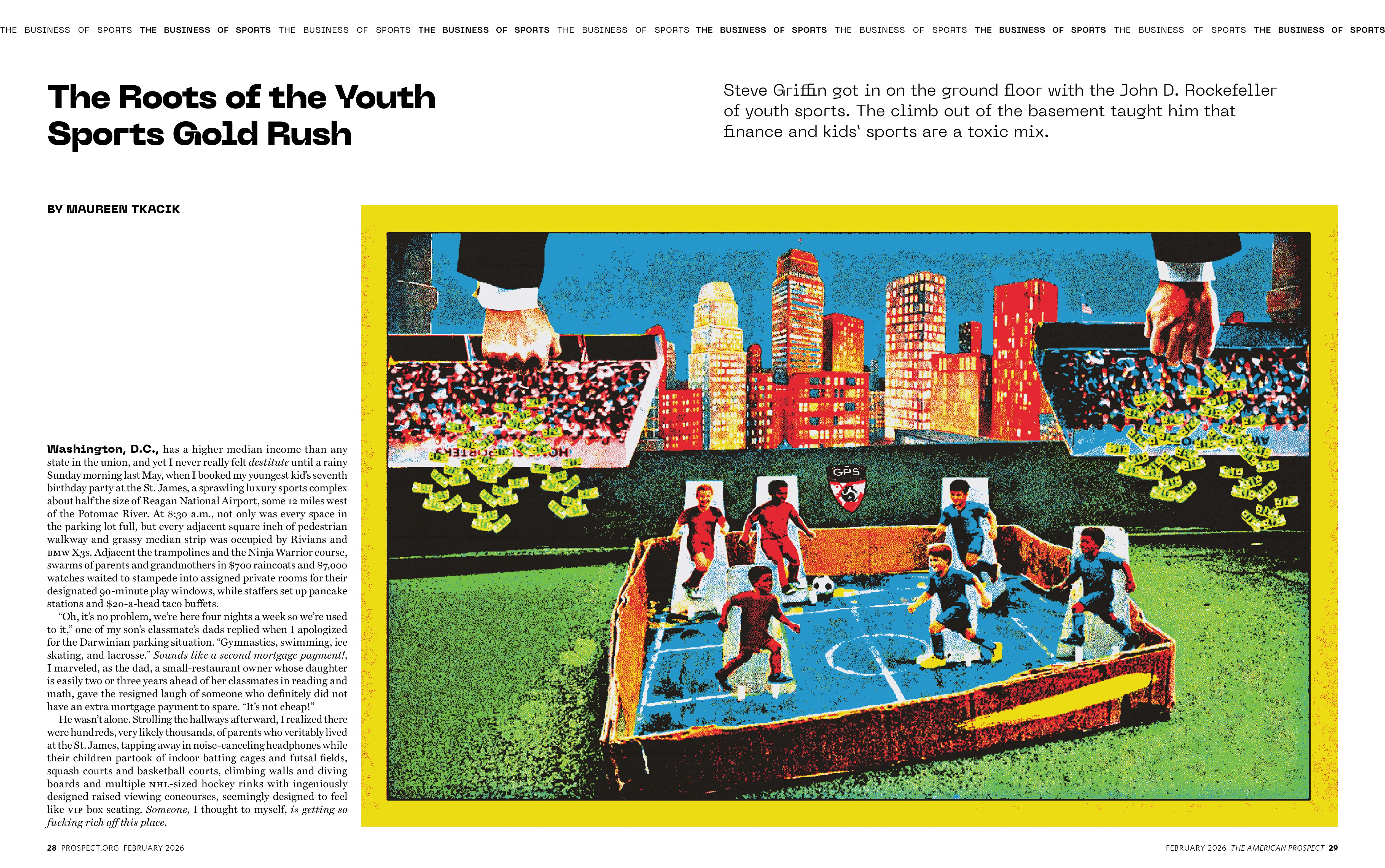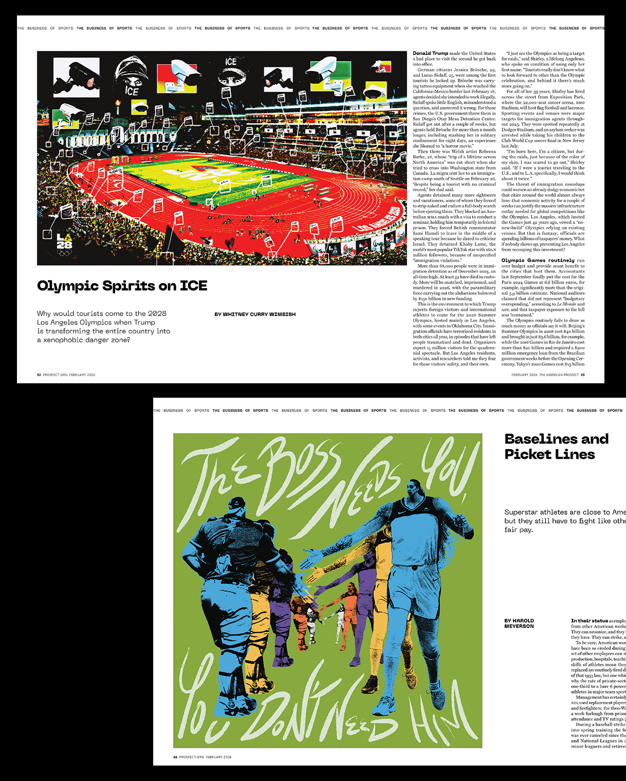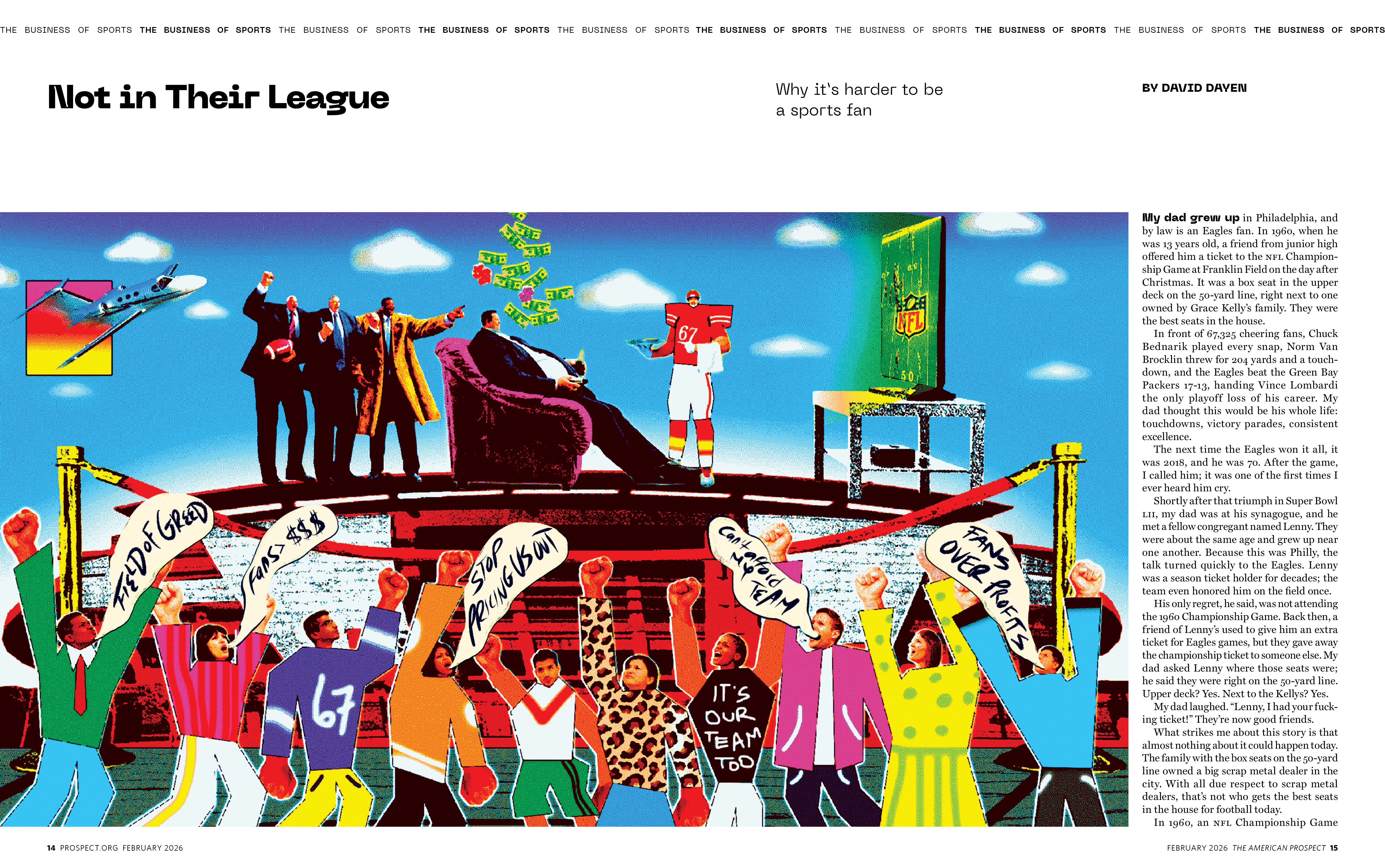 Editorial illustration work for The American Prospect’s February 2026 issue exploring the politics and economics of modern sports, from ownership and labor rights to fan culture and inequality.